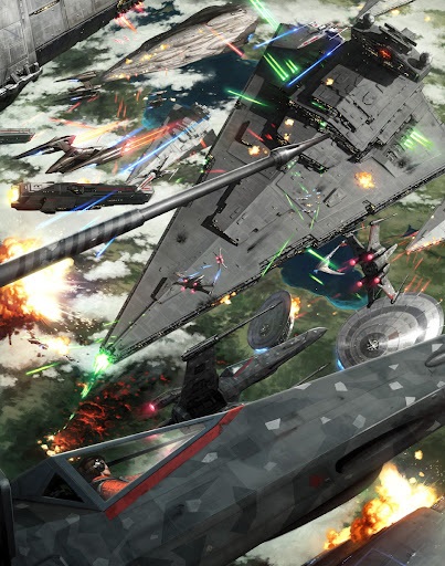 This wallpaper showcases the space battle from the perspective of the pilot looking down. The number of ships and dog fights in the piece allows one to view something new when coming back to it.
