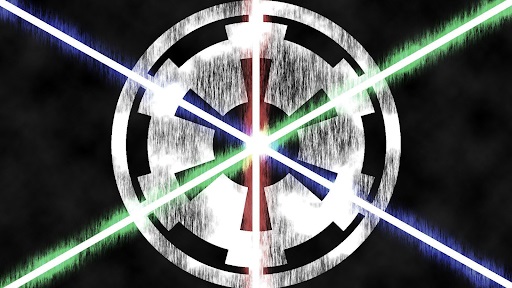 This wallpaper encases the three main lightsaber colors and the empire symbol. This wallpaper displays the entanglement of the Jedi and Sith in the order of the empire.