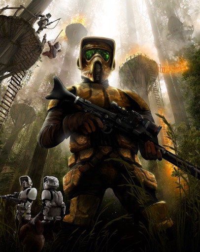This wallpaper shows the scout troopers of the Empire in the treetop villages. The scout troopers are killing the Ewoks and clearing the land. The detail is shown in the main scout trooper and the background makes this wallpaper spectacular.